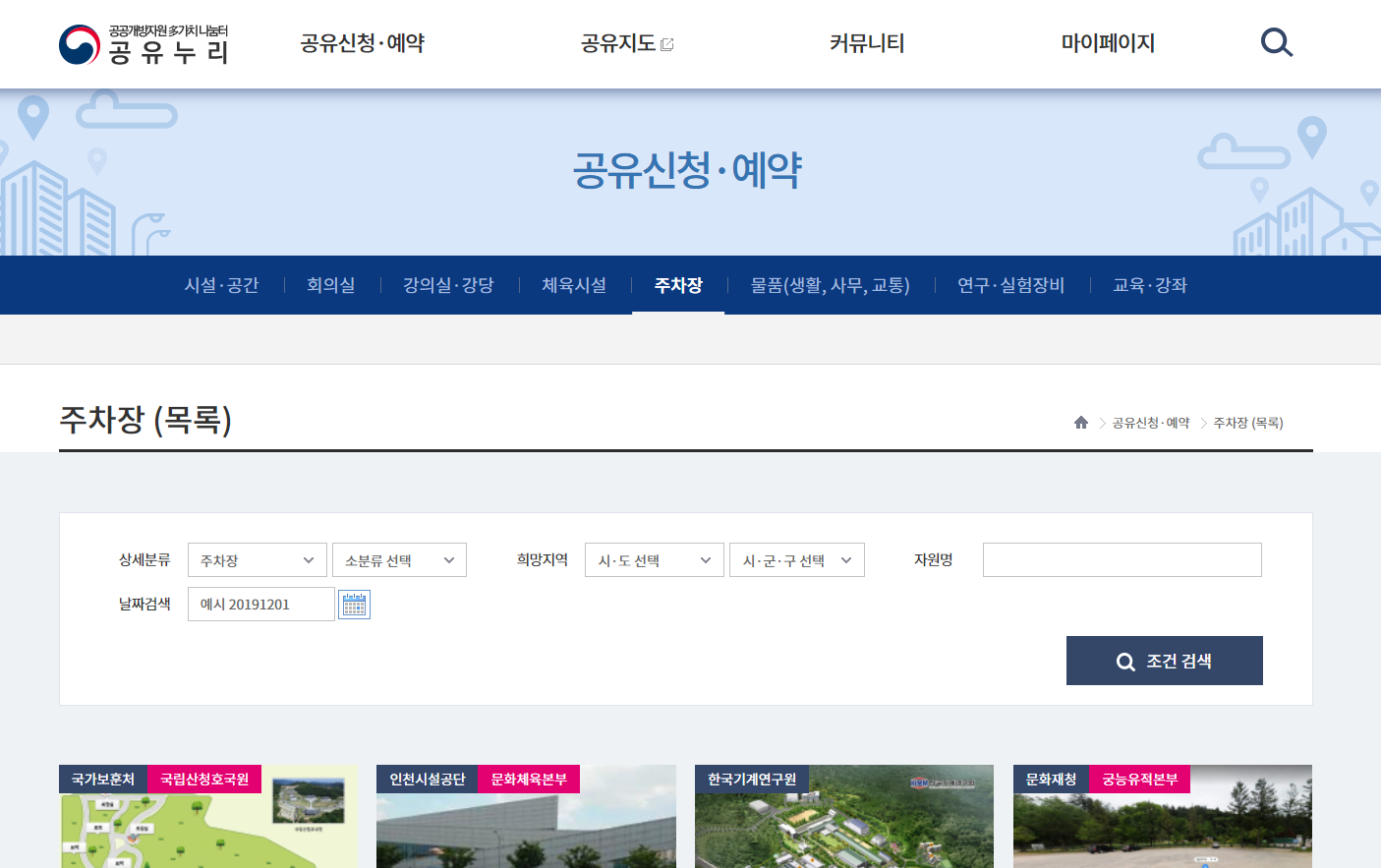 전국에서 무료주차가 가능한 방법이지만 서울에 일을 보러 가거나 잠시 주차를 해야 할 때 무료로 주차할 수 있는 방법에 대해 알아보겠습니다. 바로 공유누리입니다. 공유 누리는 중앙행정기관, 지방자치단체, 공공기관 등 공공부문에서 국민에게 개방하는 시설, 물품 등 공공 개방 자원을 국민이 온라인에서 쉽고 편리하게 검색하고 예약하는 대국민 공공개방 지원 공유 서비스 포털입니다. 즉, 누구나 이용 가능한 공공기관의 주차장 정보를 쉽게 찾아보고 이용할 수 있습니다.