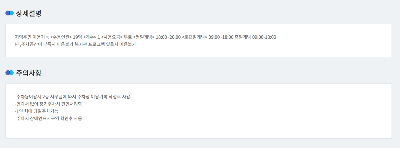 예약하기 위해서는 회원가입을 해야 하기 합니다. 하지만 무료로 주차할 곳을 예약할 수 있는데 회원가입을 하지 않을 이유가 없겠죠? 그리고 스크롤을 내려보면 해당 지역의 정보들을 확인할 수 있습니다. 기본적인 위치나 제공기관, 예약방법, 최대 주차 정원과 주의사항 등을 확인할 수 있습니다.