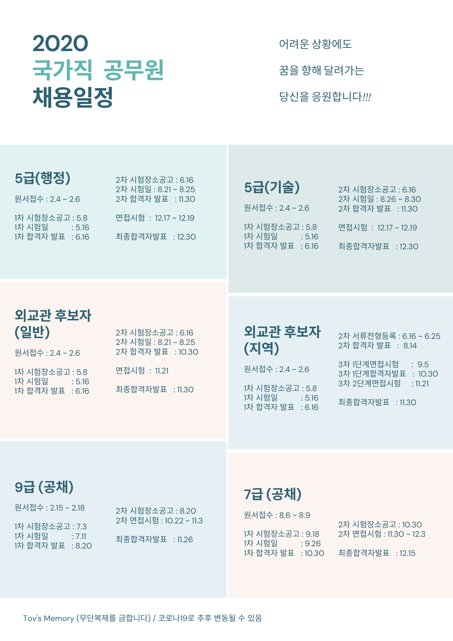 코로나19로 인해 연기되었던 국가직 공무원 시험일정이 나왔습니다. 아직 코로나19로 인해 언제든 변경 가능하지만 올해 안에 일정이 나와 시험을 볼 수 있다는 점이 한편으로 다행인 것 같습니다. 다른 많은 시험에 비해 시험 보는 사람이 많기 때문에 또는 공무원이 코로나 19 방역으로 바쁘기 때문에 등 여러 가지 이유가 있겠지만 재공고 된 일정이 변경되지 않고 잘 진행되어 더 이상의 연기 없이 잘 진행되기를 희망합니다.