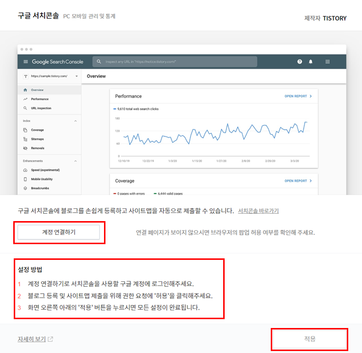 구글서치콘솔을 클릭 후 이곳에서 구글 계정을 연결해주면 끝이 납니다. 정말 간단하죠. 이렇게 구글 서치 콘솔에 사이트맵 등록이 정말 쉬워졌습니다. 위 사진에 설정 방법처럼 권한을 모두 허용으로 해주신 뒤 적용 버튼을 눌러주시면 됩니다. 나의 사이트맵을 확인하는 방법은 내 블로그 관리에서 확인이 가능합니다.