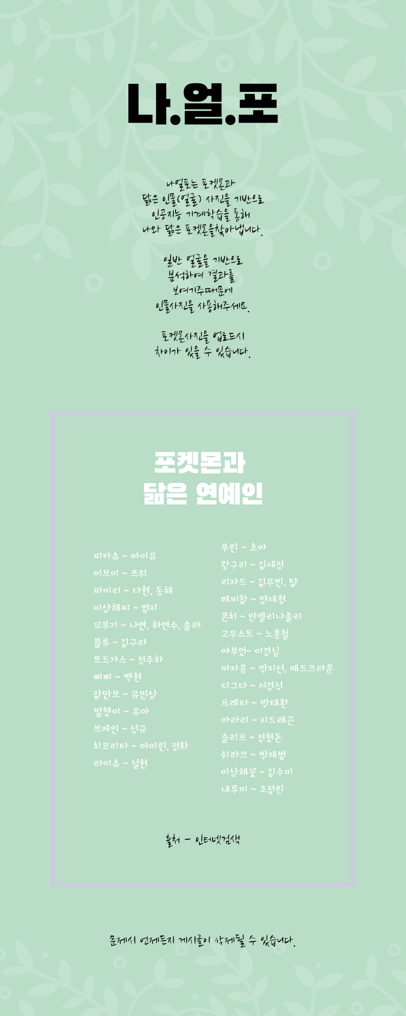 안녕하세요. 나와 닮은 포켓몬은 무엇일까요? 28마리의 포켓몬을 인공지능 기계학습을 통해 내 사진을 분석한 결과를 친구들과 공유해보아요~! 아래에 바로 사진을 올리면 바로 분석합니다.