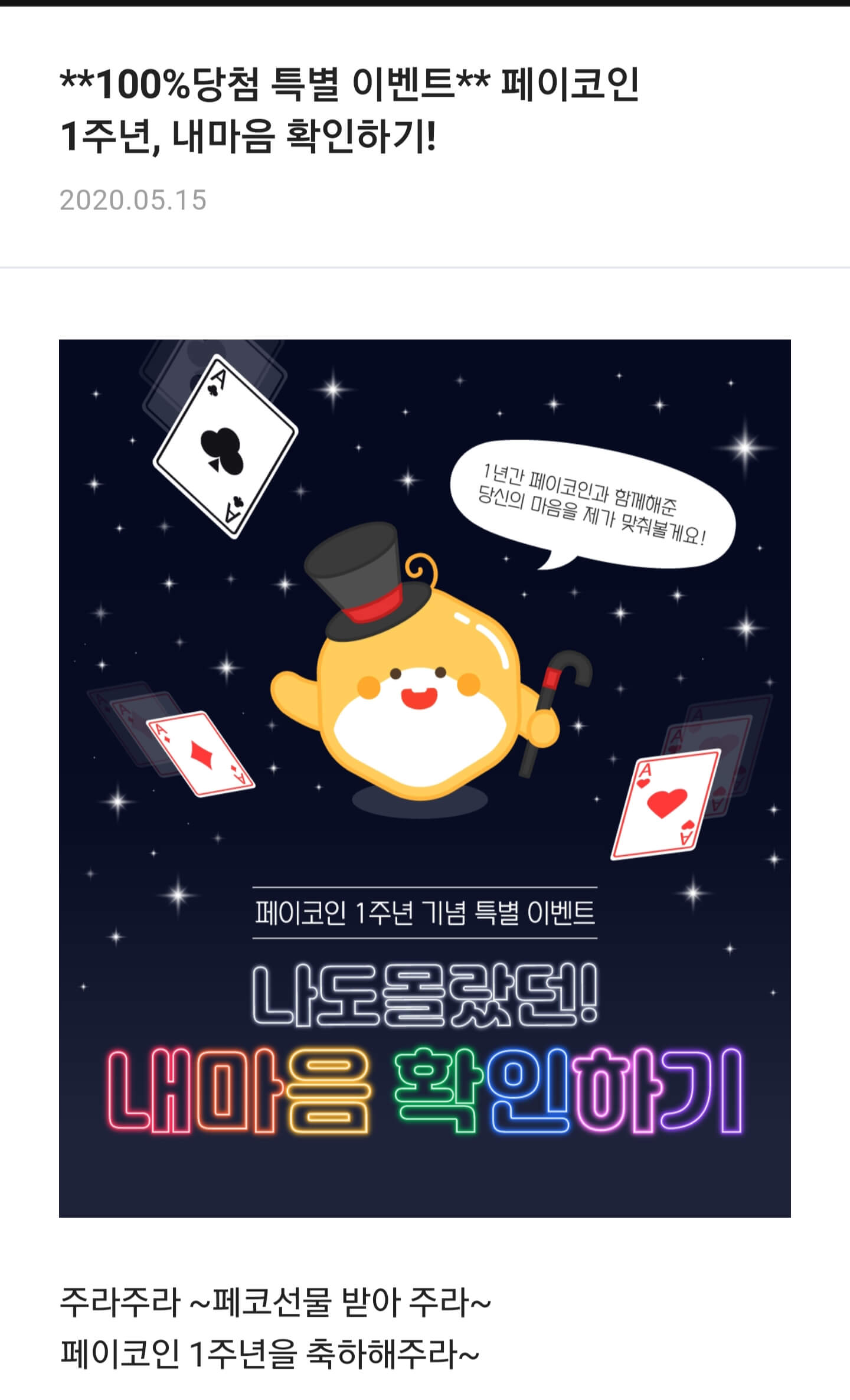 페이코인이 나온 지 1년이 지나서 페이코인을 사랑해주신 모든 분들께 1주년 특별 이벤트로 최대 145PCI를 지급한다고합니다. 룰렛 돌린후 즉시 지급됨으로 바로 확인할 수 있습니다. 1인당 1회 참여가능하고 시세변경에따라 지금수량이 변경될 수 있다고 하네요. 얼른 룰렛돌리러 가요!