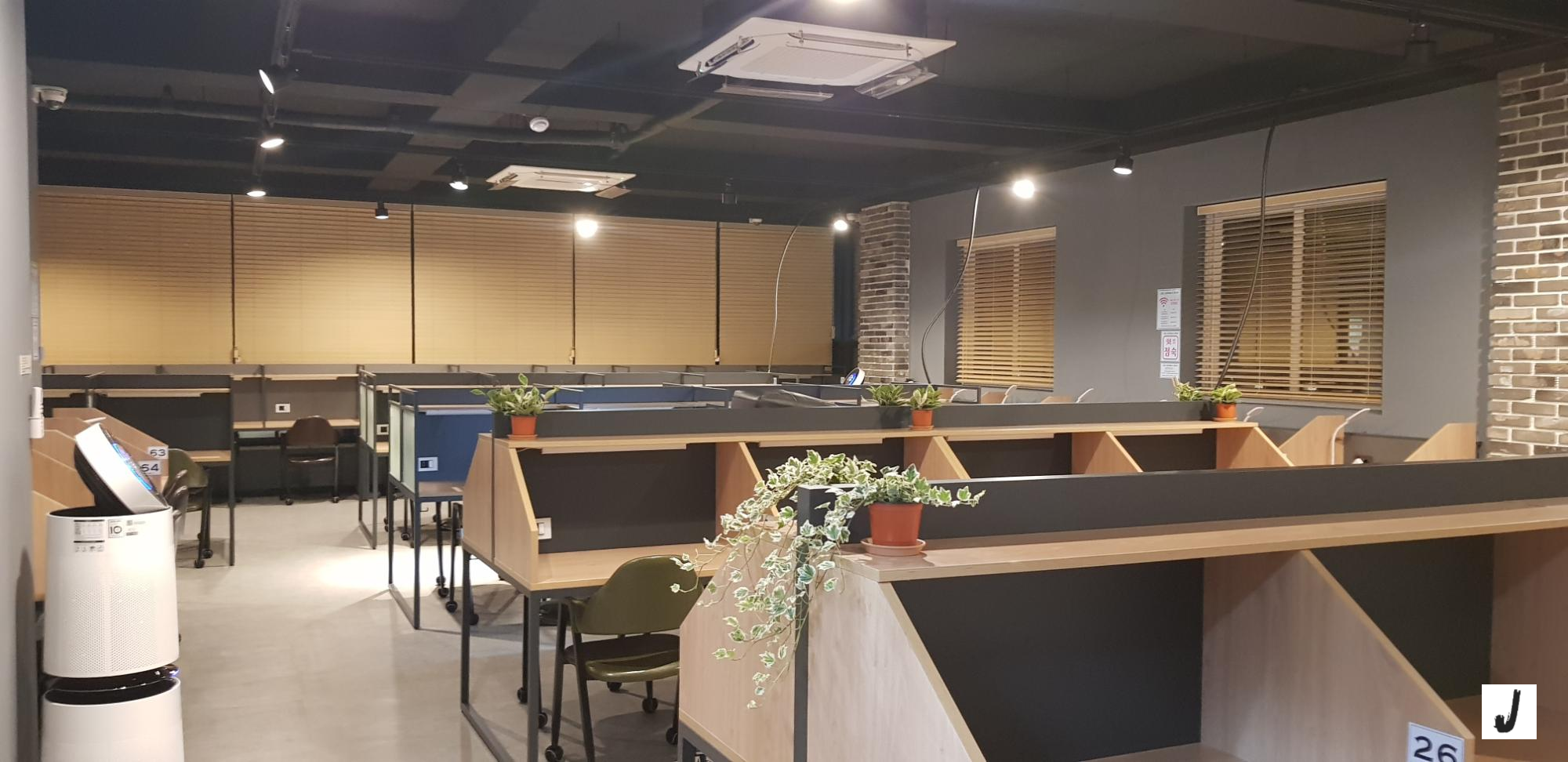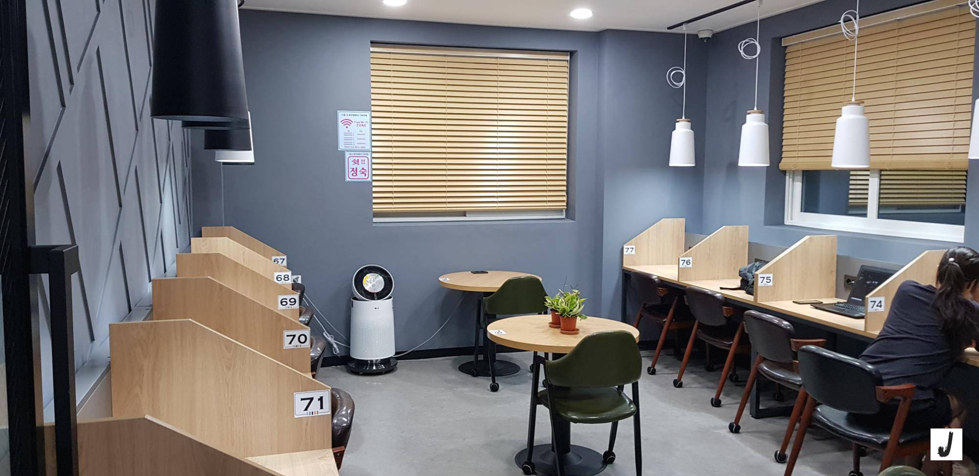 공부하는 IntoZone에 들어갔을 때 인테리어를 전혀 알지 못하는 저도. 갑갑했던 독서실보다 편안함을 느꼈어요. 그리고 벽에 있는 세계지도는 스터디인투의 시그니처(?)인 것 같습니다! 너무 멋있더라구요. 특히 곳곳에 공기청정기가 있어서 공기마저도 쾌적하게 공부할 수 있었어요. 또한 창가와 벽 쪽으로 인기 많은 자리들도 많이 있어서 좋더라고요 ㅎ