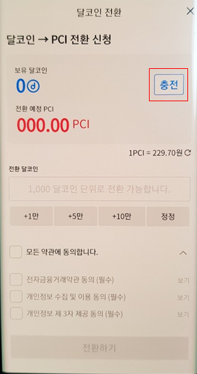 B. 페이코인(PCI)으로 전환할 보유 달코인 설정 (없으면 충전)
