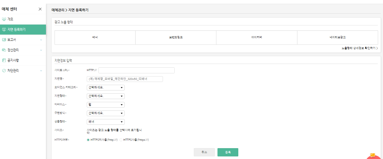 크게 광고 형태는 배너, 브랜드 링크, 아이커버, 네이티브 광고가 있습니다. 배너의 형태에 궁금하신 분들은 네이티브 광고 아래에 광고 형태 상세정보 확인하는 곳이 있으니 참고하시면 되겠습니다. 아래 지면 정보 입력란에 맞춰지면를 등록합니다. 특히 지면 형태에 따라 웹과 앱은 분리되어 있으니 해당 유형에 맞게 선택해 주세요.
