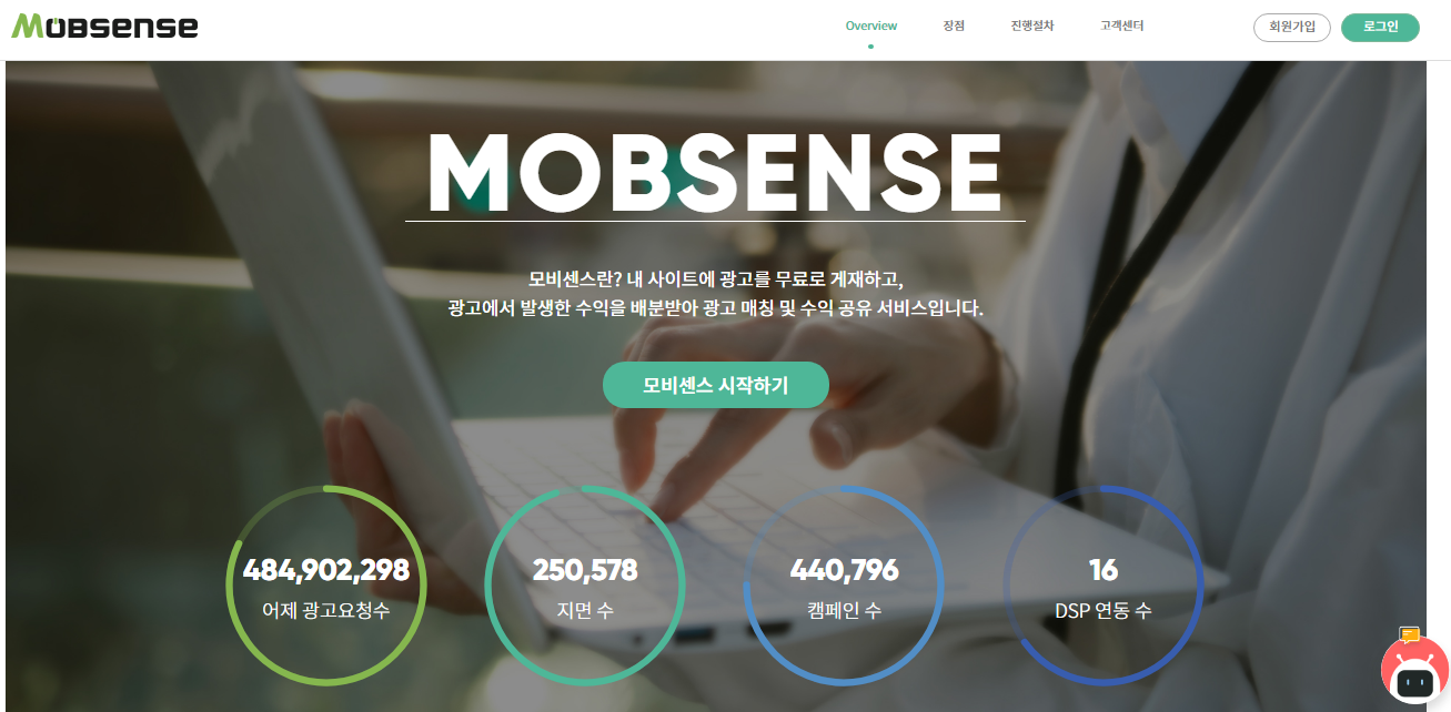 MOBSENSE 모비센스란? 내 사이트에 광고를 무료로 게재하고, 광고에서 발생한 수익을 배분받아 광고 매칭 및 수익 공유 서비스입니다. 모비센스 시작하기 484902298 K 어제 광고요청수 250578 K 지면 수 440796 K 캠페인 수 16 K DSP 연동 수
