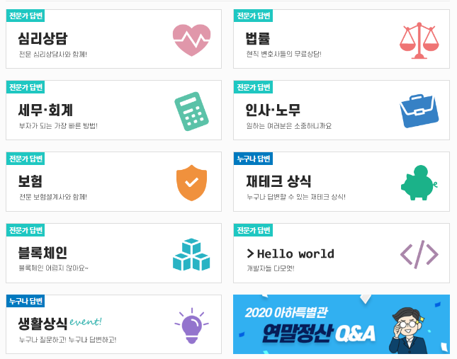 아하는 전문 지식 검색을 무료로 할 수 있는 곳이에요. 변호사, 세무사, 변리사 등 많은 전문직에 종사하는 분들께서 직접 답변을 해주시는데요. 지금도 질문 항목들이 늘어나고 있습니다.