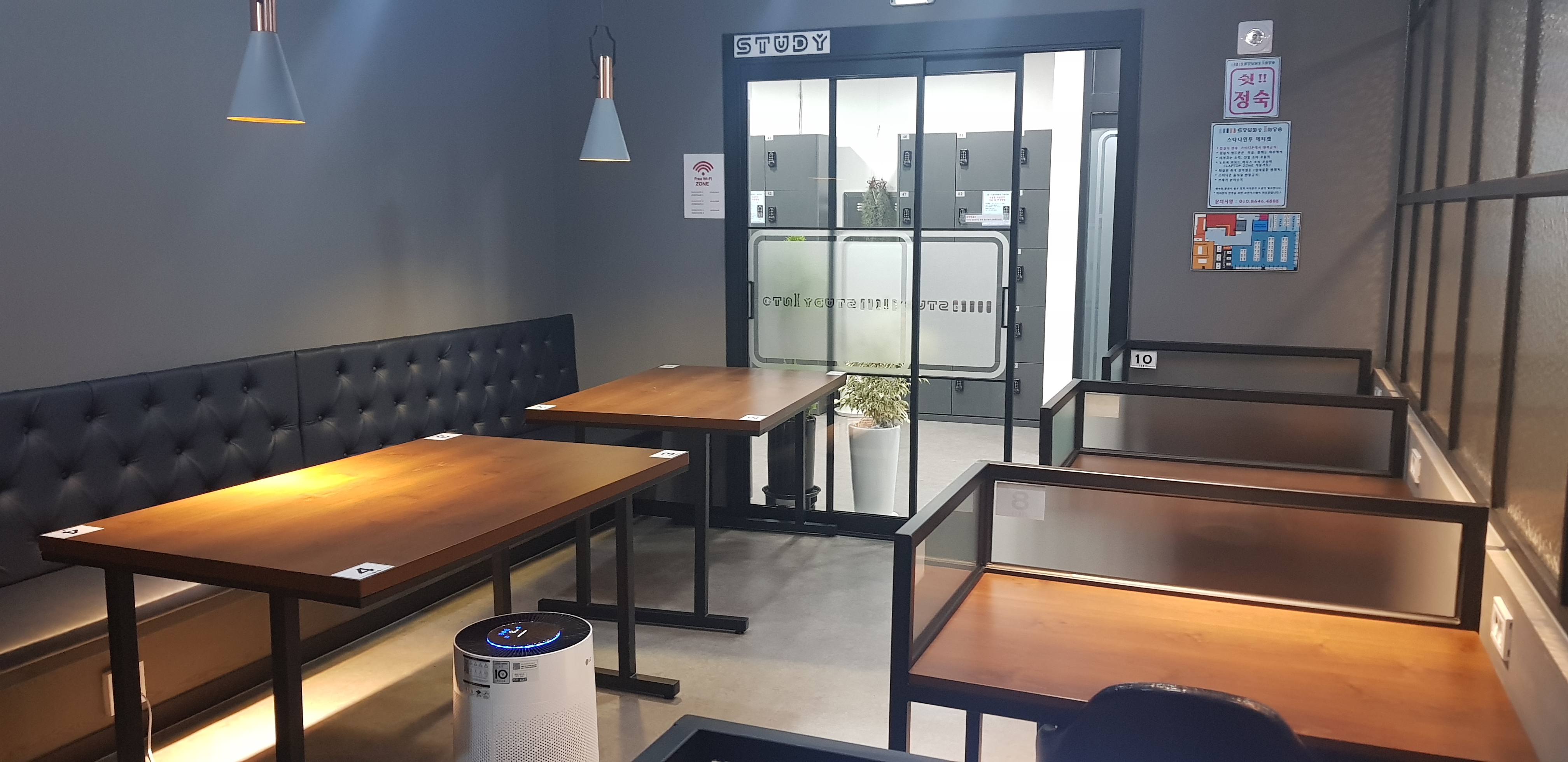 제가 사진을 잘 못 찍어서 다 담아내지 못한 부분들이 아쉽네요. 그리고 곳곳마다 공기청정기가 있어 쾌적한 환경에서 공부할 수 있었어요. 그리고 각 책상마다 스마트폰 고속 충전이 가능한 콘센트? 가 있어서 인강을 듣는 태블릿이나 스마트폰 충전하기가 좋았습니다. 그리고 3단계 전등으로 밝기를 조절할 수 있었는데 눈에 크게 부담가지 않는 점도 좋았습니다. 물론 저는 중간단계의 밝기를 좋아해서 불편한 부분은 아니었습니다.