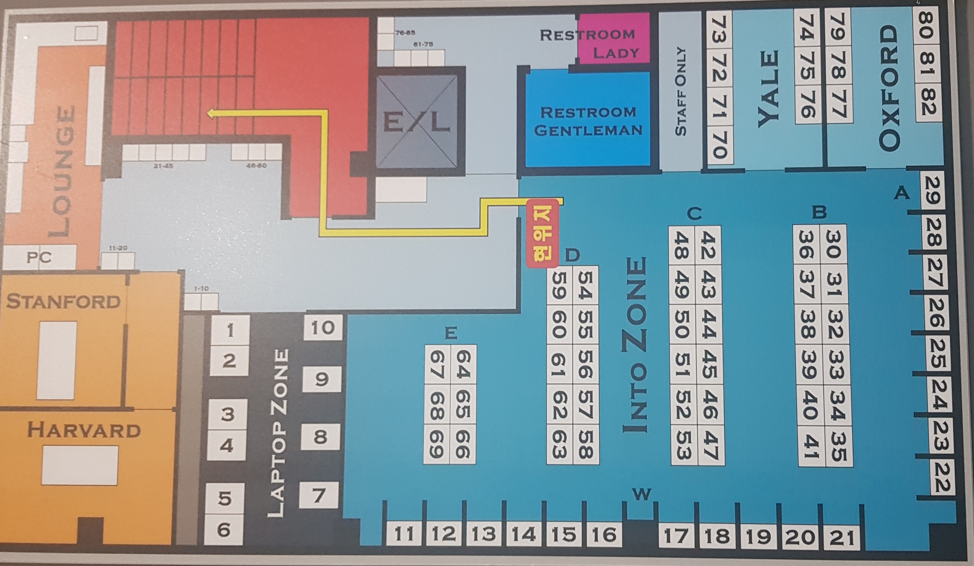 크게 Into Zone, Laptop Zone, Yale, Oxford에서 공부할 수 있었어요. Stanford와 Harvard는 공부하기보다는 회의를 할 수 있는 곳 같았습니다. 저는 회의를 할 일이 없었으니 그 외의 공간들을 이용했습니다.