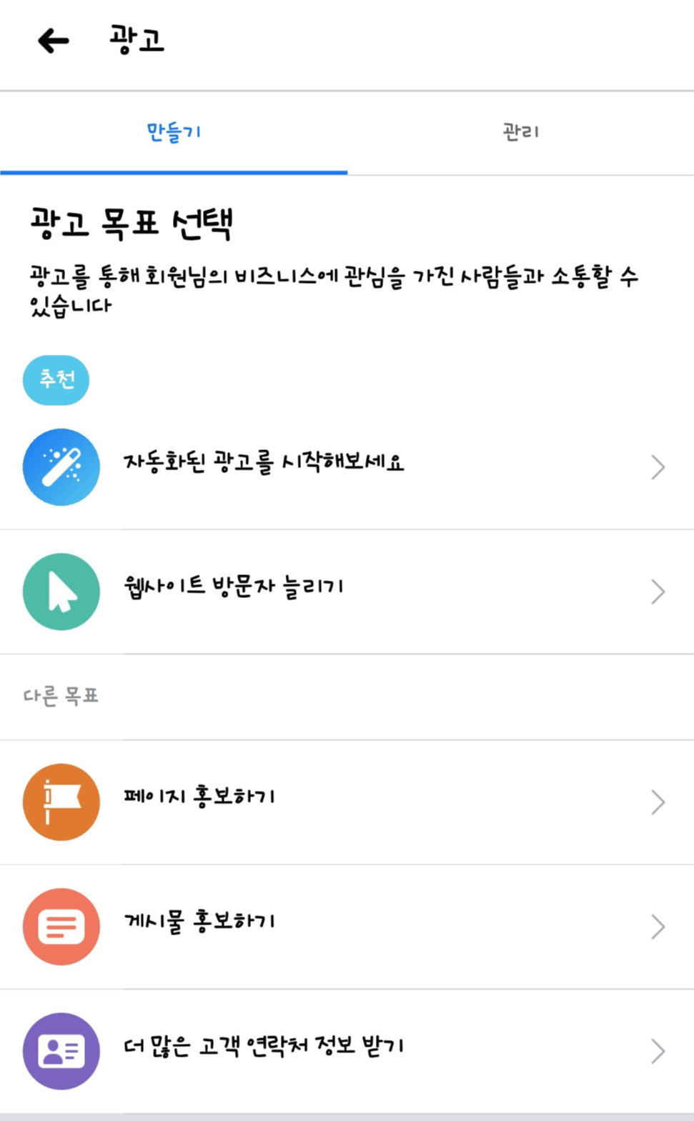 광고는 크게 자동화된 광고, 웹사이트 방문자를 늘리기, 페이지 홍보, 게시물 홍보, 더 많은 고객 연락처 정보 받기 이렇게 5가지가 있습니다. 저는 이 중에서 웹사이트 방문자 늘리기를 선택했어요.