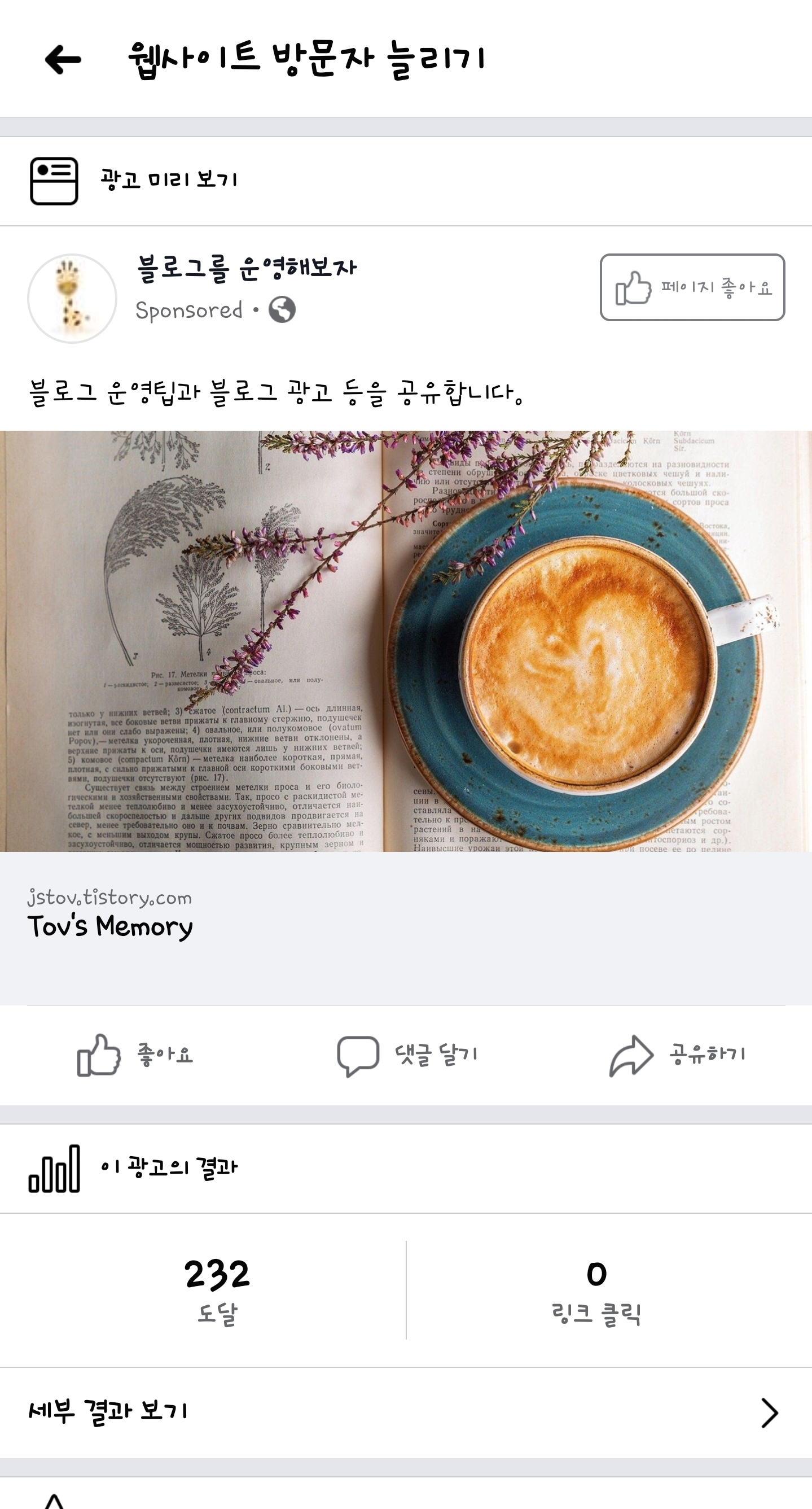 결과는 처참했습니다. 232명에게 제 웹사이트가 홍보되었지만 링크 클릭은 0명 이었습니다. 타깃설정에도 실패했고 콘텐츠도 관심이 없는 콘텐츠였던것 같아요. 예산은 약 1,200원 정도였는데요. 1,200원당 232명이면 하루에 커피 한잔으로 1,000명에게 자신의 블로그를 홍보할 수 있는 것입니다. 우리가 애드센스 광고를 넣는 것과 반대로 우리가 광고주로서 돈을 지불하고 광고를 하는 경험을 해보실 수 있어요. 애드센스를 블로그에 광고 넣으면서 '과연 많은 사람들이 눌러줄까?'라고 생각했는데 정말 잘 안 눌러준다는 사실이 마음이 아프네요.