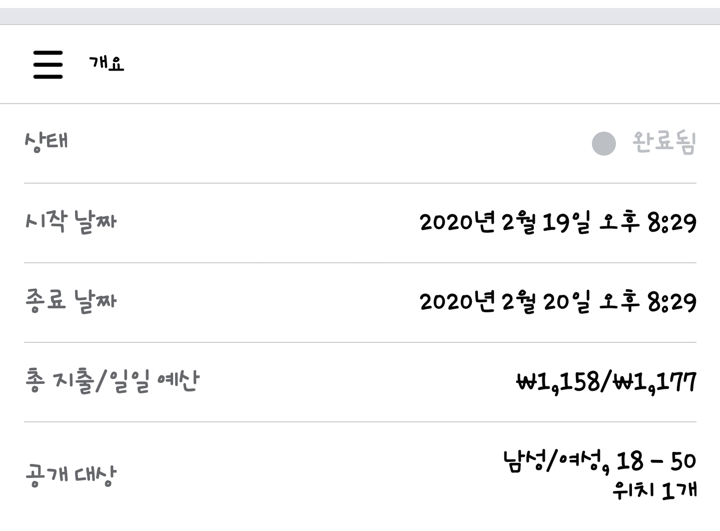 아무튼 테스트를 위해 페이스북 광고를 넣어봤는요. 제가 홍보한 광고는 블로그 운영에 대한 팁을 광고했었기 때문에 타깃을 설정하기가 어려웠습니다. 그런데 콘텐츠가 확실한 블로그의 경우 혹은 판매를 위한 블로그를 운영하시는 분들에게는 좋은 광고가 될 수 있다고 생각됩니다. 매일 꾸준한 광고로 유입이 증가한다면 충분히 해볼 만한 광고이기 때문에 시도해보시는 것도 좋은 것 같습니다.