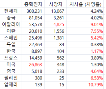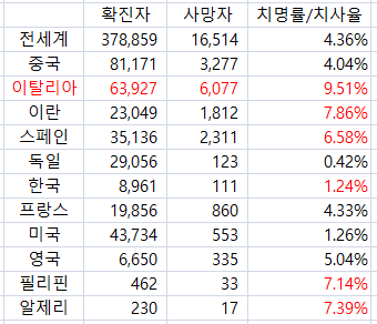 2020/03/26 - [정보/알쓸신잡] - [정보] 코로나19 전 세계 현황과 치사율/치명률 비교 2020.03.26.