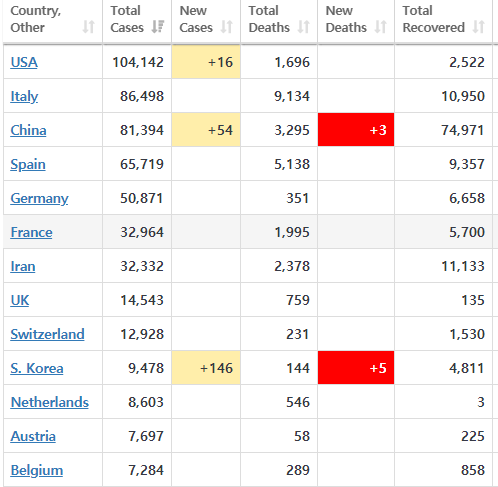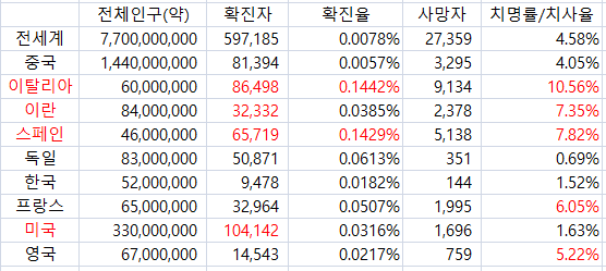 2020/03/30 - [정보/알쓸신잡] - [정보] 전 세계 코로나19 치명률/치사율/완치율/회복률 비교 2020.03.30.