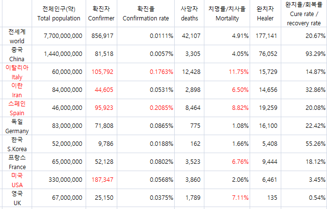 [정보] 전 세계 코로나19 치명률/치사율/완치율/회복률 비교 (16) | 2020.03.30 |