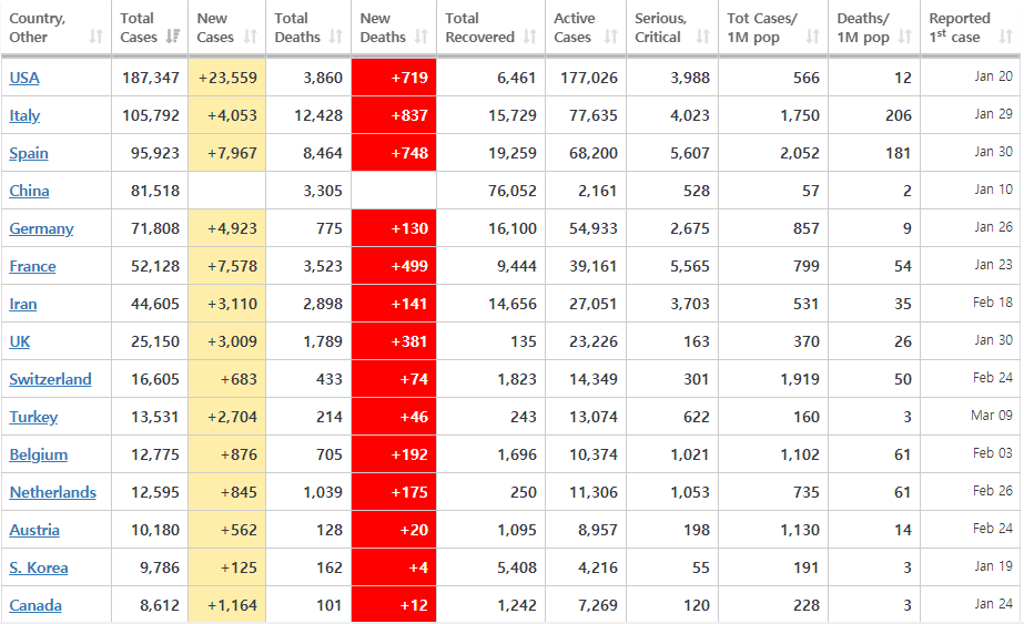 많은 나라가 코로나19로 인해 어려운 시기를 지나고 있습니다. 현시점의 통계는 발표된 자료를 기준으로 하기 때문에 상황을 파악하는 용도로만 봐주시면 좋을 것 같습니다. 전 세계의 총확진자는 856,917이며, 많은 확진자가 미국에서 발생하고 있습니다. 빠른 검사속도에 따라 확진자가 많이 나올 수 있지만 그만큼 미국 내 코로나 19가 많이 확산되었다는 점이 이 상황을 더 심각하게 바라봐야 할 것 같습니다. 특히 뉴욕의 확진자가 4만 명을 넘었습니다. 미국 전체 확진자의 20%에 해당하는 인원입니다. 인구이동이 많은 뉴욕의 확진자가 많은 것은 맞지만 그만큼 다른 곳으로 퍼졌을 것을 예상됩니다.